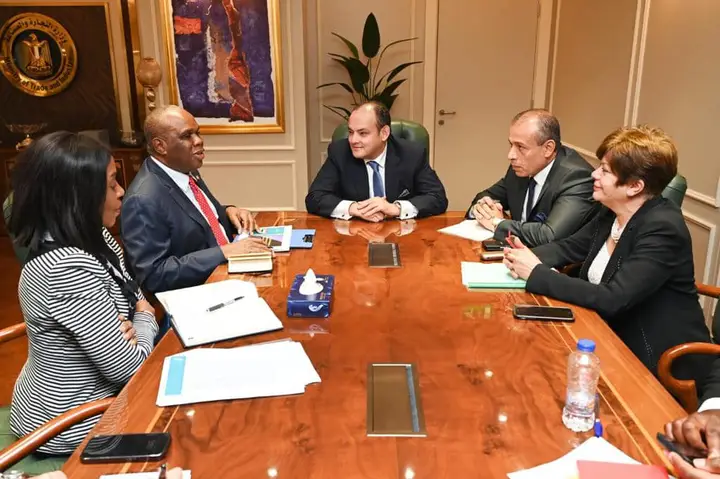 استضافة مصر لمعرض التجارة البينية الأفريقيعقد المهندس/ أحمد سمير - وزير التجارة والصناعة لقاءً موسعاً مع السيد / بندكت اوراما رئيس مجلس ادارة البنك الأفريقي للإستيراد والتصدير"أفريكسيم بنك" والوفد المرافق لهبحضور السيدة/ مي عسل - رئيس الهيئة العامة للمعارض والمؤتمرات، و الوزير المفوض التجارى / يحيى الواثق بالله - رئيس جهاز التمثيل التجاري، والسيد أيمن الزغبي/ -رئيس قطاع تمويل التجارة و الاستثمار و الشركات بالبنك الأفريقي للتصدير و الاستيراد. |