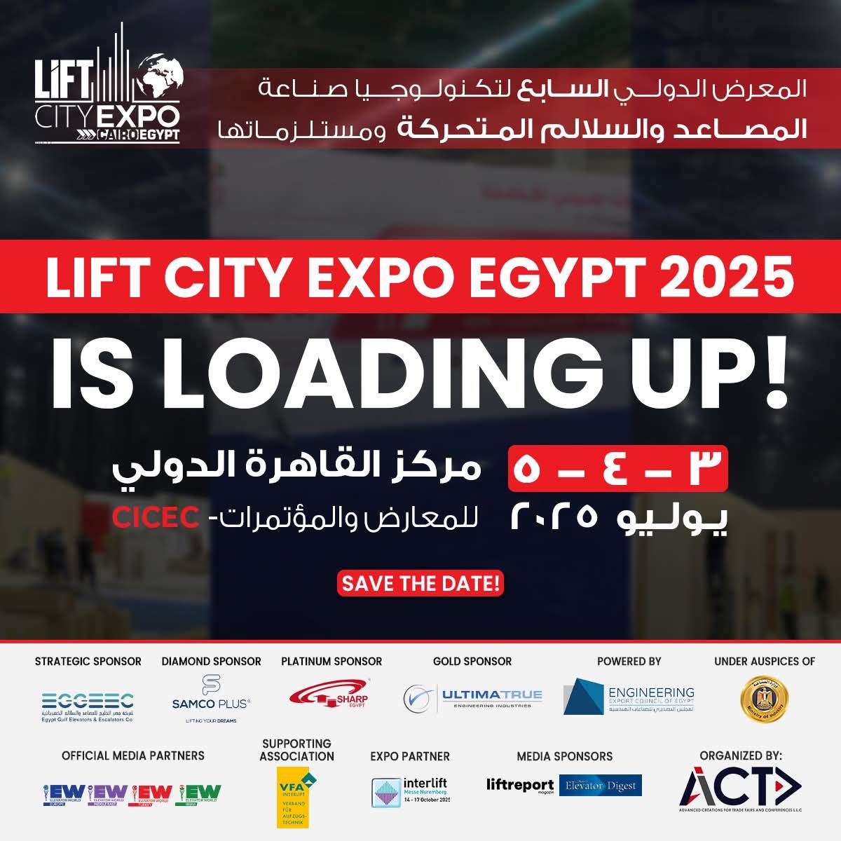 ![]() "Lift city Expo Egypt 2025 " المتخصص في تكنولوجيا صناعة المصاعد والسلالم المتحركة، في الفترة من 3 إلى 5 يوليو 2025 |