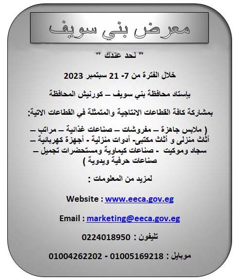 تنظم الهيئة المصرية العامة للمعارض والمؤتمرات معرض " السوق المصري" المقرر عقده بمحافظة بني سويف خلال الفترة من ٧ إلى ٢١ سبتمبر المقبل تحت شعار "لحد عندك" |